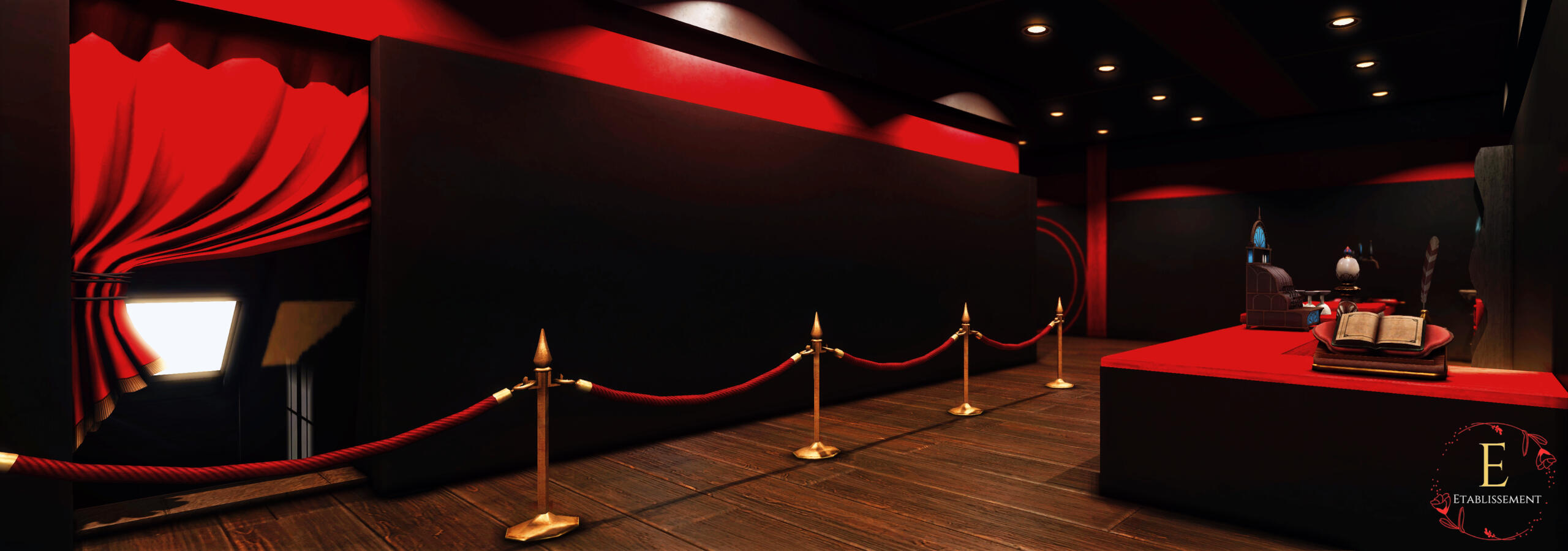 Meldet euch drinnen bitte zuerst am Empfang. Hier wird der Eintritt (nur im RP) entrichtet und ihr werdet in den WKK eingeladen. Anschließend könnt ihr euch an der Bar ein Getränk organisieren, bevor ihr nach unten geht.